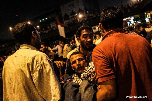 Supporters of ousted Egyptian President Mohamed Morsi carry an injured protester in Ramsis square, downtown Cairo, Egypt on July 15, 2013. Clashes erupted between pro-Morsi protesters and riot police when police force fired teargas and rubber bullets at a pro-Morsi march heading to Giza square, at least 100 protesters are injured, according the official Egyptian Ambulance Organization. (Xinhua/Amru Salahuddien)