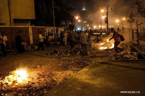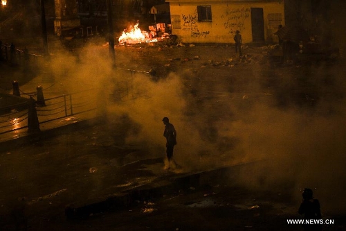 Supporters of ousted Egyptian President Mohamed Morsi clash with riot police in Ramsis square, downtown Cairo, Egypt on July 15, 2013. Clashes erupted between pro-Morsi protesters and riot police when police force fired teargas and rubber bullets at a pro-Morsi march heading to Giza square, at least 100 protesters are injured, according the official Egyptian Ambulance Organization. (Xinhua/Amru Salahuddien)